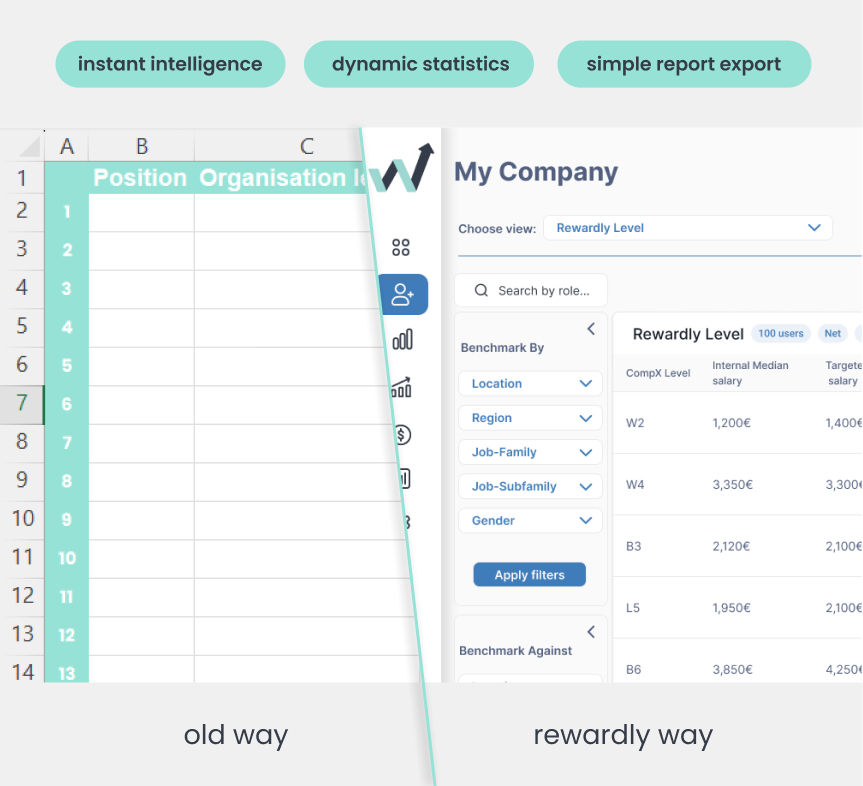 Automated calculations: Say goodbye to chaotic Excel sheets. Rewardly automates complex calculations, allowing you to quickly generate accurate compensation benchmarks without the need for manual data manipulation.