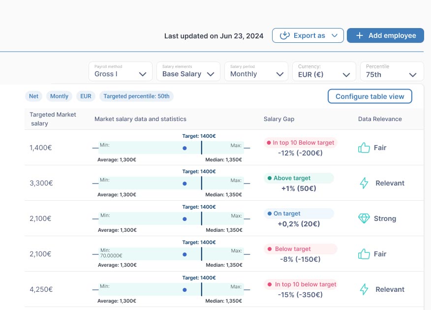 Automatically identify gaps in salaries, bonuses and benefits with our self-calculating tools. Visualize disparities and prioritize adjustments to align with market trends. Ensure fair and equitable pay practices across your company effortlessly.